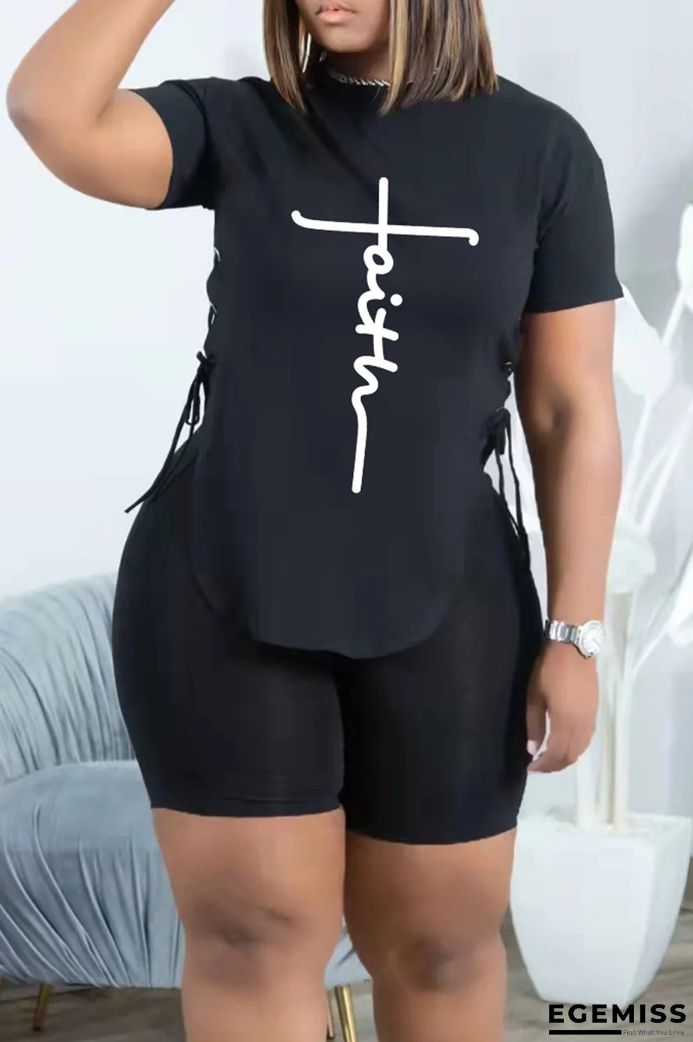 | Product Name | Black Casual Print Draw String O Neck Short Sleeve Two Pieces |