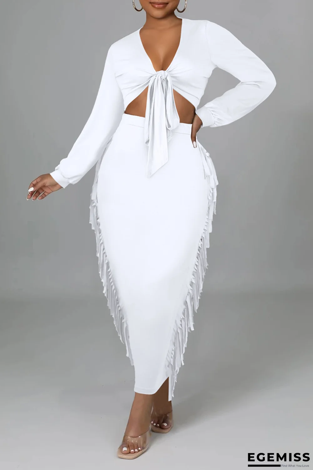 | Product Name | White Sexy Solid Tassel V Neck Long Sleeve Two Pieces |