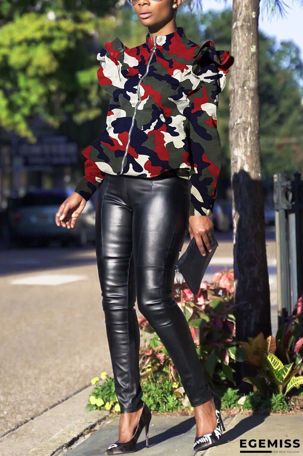 | Product Name | Wine Red Fashion Camouflage Print Stand Collar Coat |