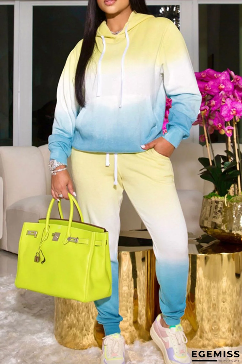 | Product Name | Yellow Blue Fashion Casual Gradual Change Print Basic Hooded Collar Two Pieces |
