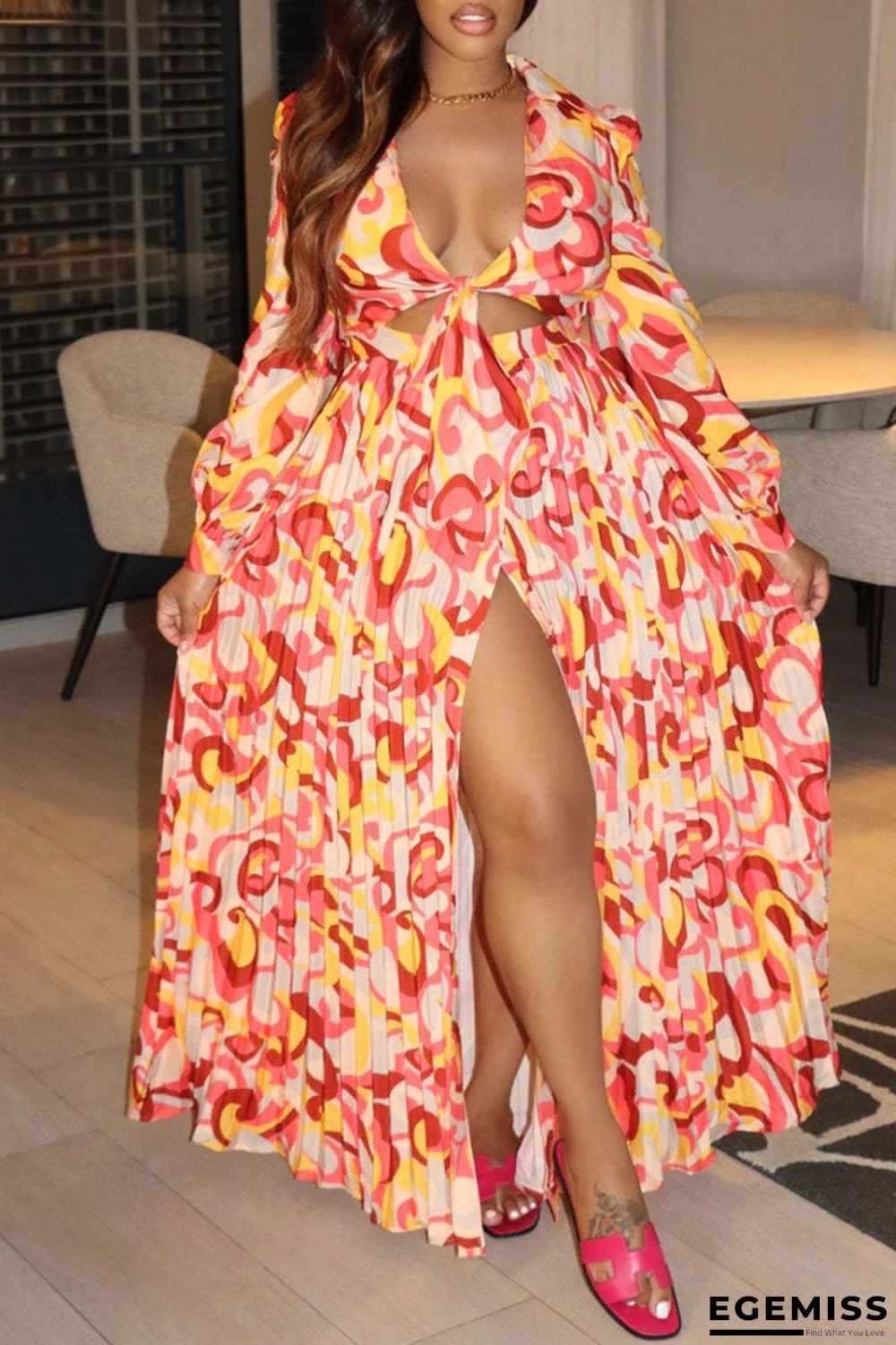 | Product Name | Yellow Fashion Casual Print Bandage Slit V Neck Long Sleeve Dresses |