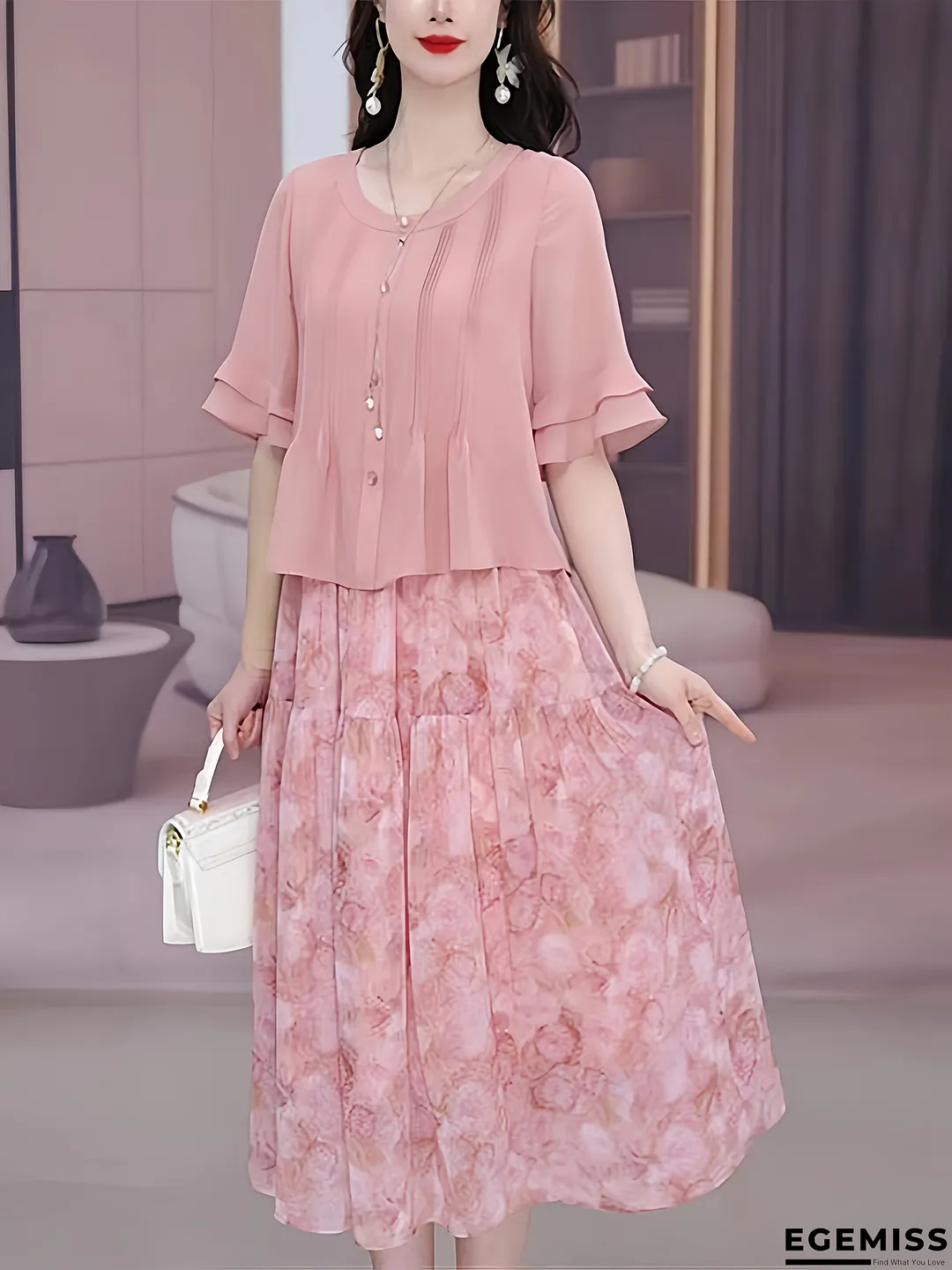Plus Size - Elegant Plus Size Floral Print Chiffon Midi Dress with Ruffle Sleeves and Button Front - Lightweight, Flowy Design for Spring/Summer/Fall, Casual Elegant Wear | Ruffle Sleeve Dress | Chiffon Fabric