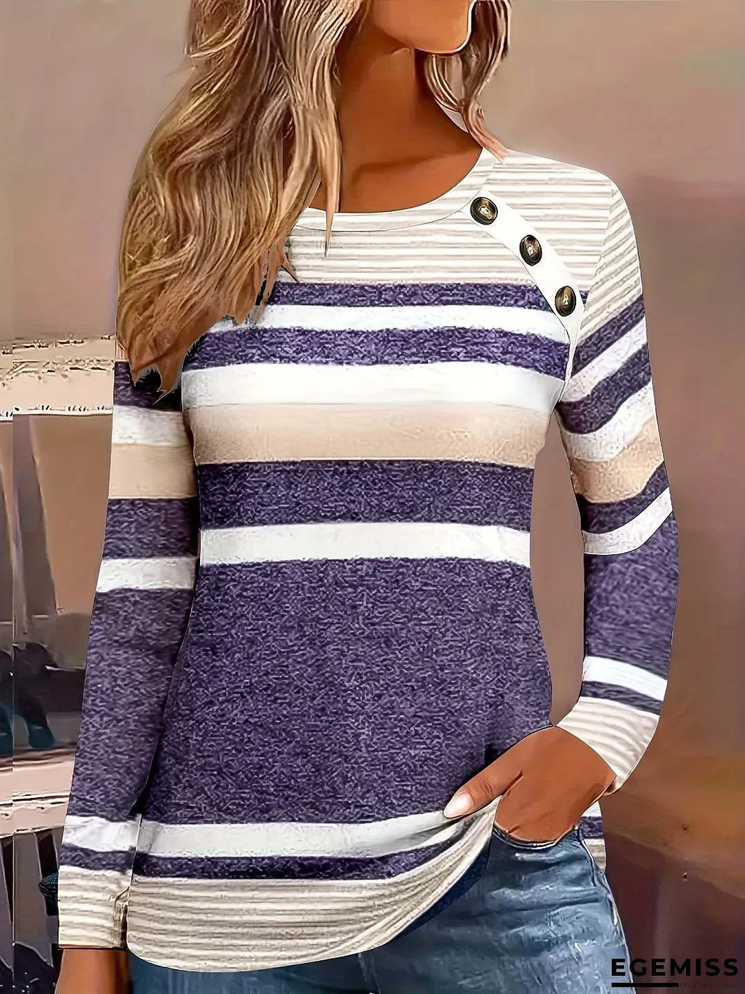 Standard Size Women's Fashion Striped Button- Long Sleeve T-Shirt