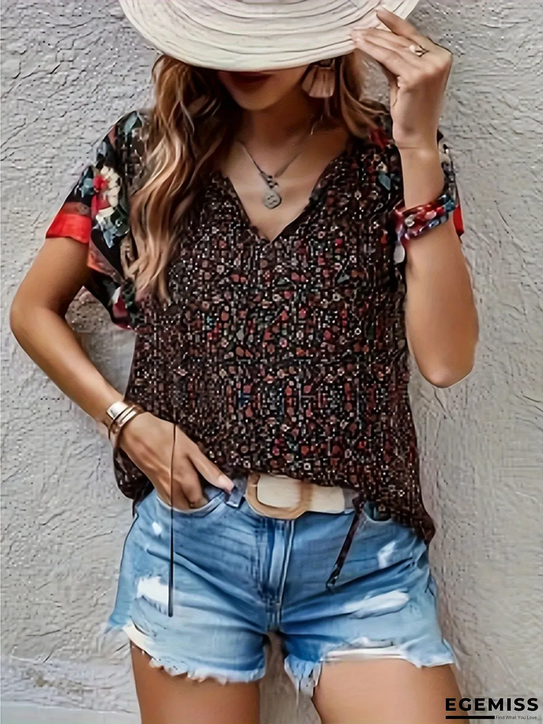 Women's Boho Tunic Blouse V Neck Short Sleeve Drawstring Waist Vacation Casual Top