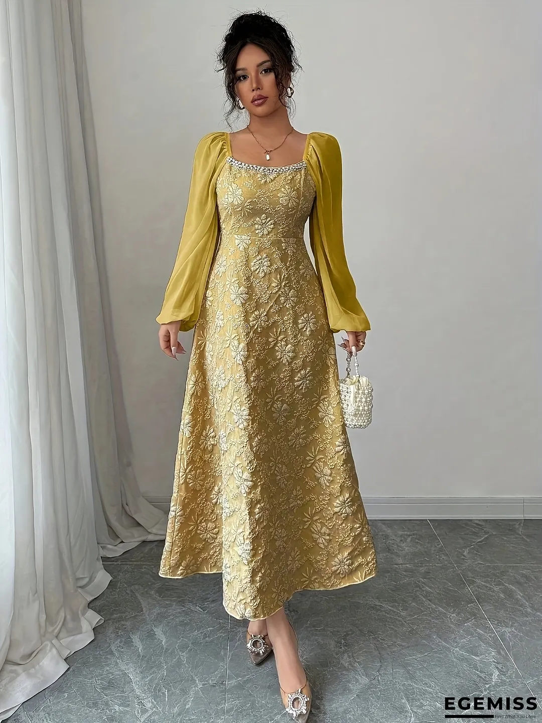 Women's Elegant Floral print A-Line dress - Long Formal & casual event gown, Machine Washable Women's Party Wedding Vacation Outfit, Date Night Outfit, Square Neckline Dress, Stylish Zipper Closure, Versatile Evening Wear
