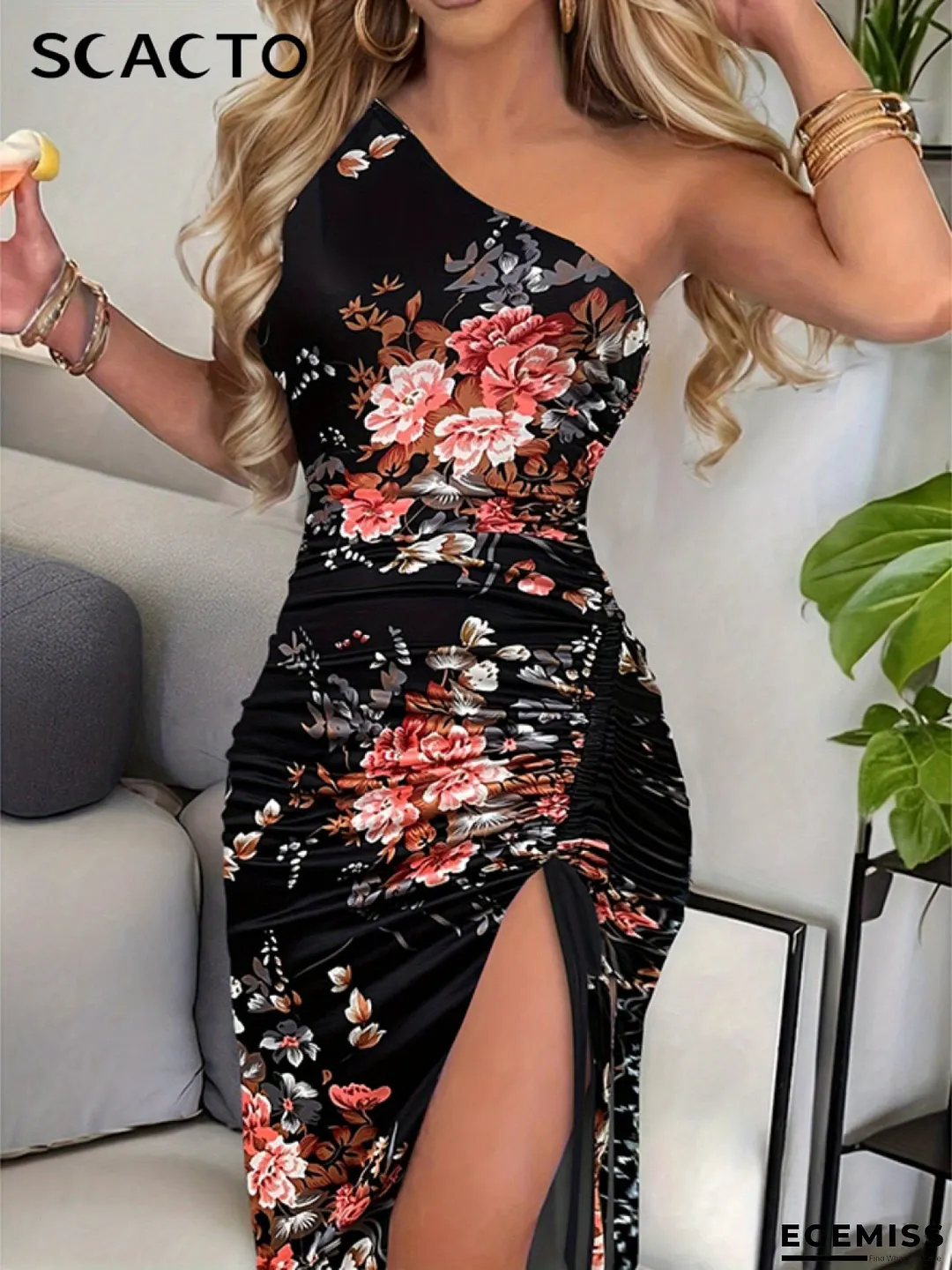 Women's Elegant One Shoulder Bodycon Dress - Navy Blue Floral Party Wedding Gown, Formal Event & Everyday Outfit - Machine Washable Glam Evening Dress, Wedding Dresses