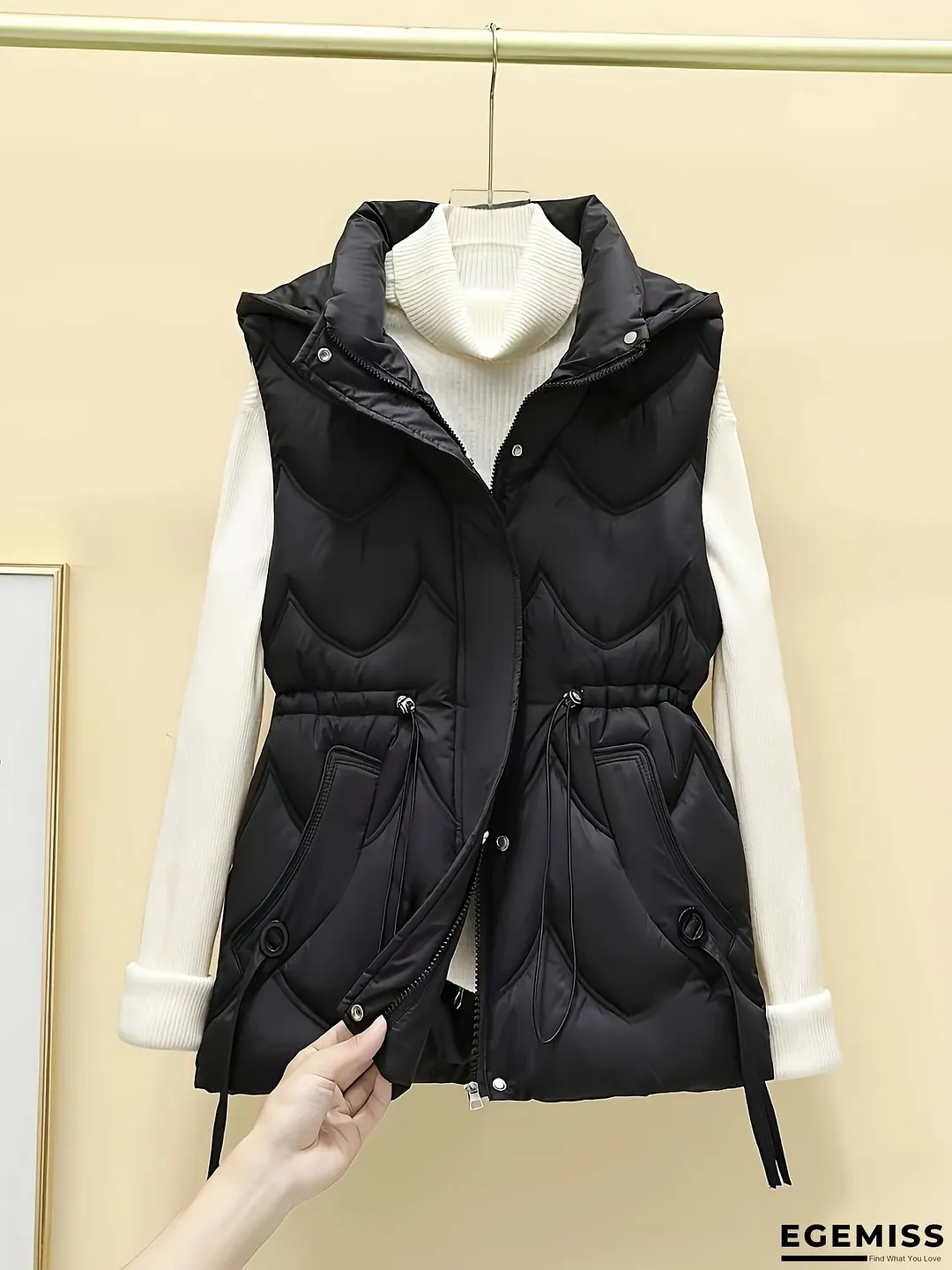 Women's Elegant Winter Vest - Short Sleeve Stand Collar with Decorative Pockets, Black & White Contrast, Regular Fit Non-Stretch Fabric for Fall Winter Layering