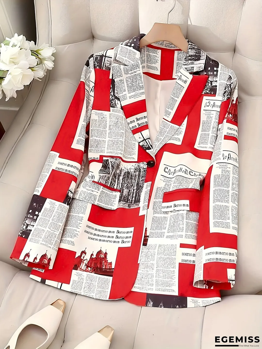 Women's Newspaper Print Blazer Jacket - Red/Black/White Office Coat, Loose Fit Lapel Jacket for Business, Casual, Everyday - Machine Washable Professional Outerwear, Seasonal Fashion, Retro Style Clothing, Singlebreasted Closure